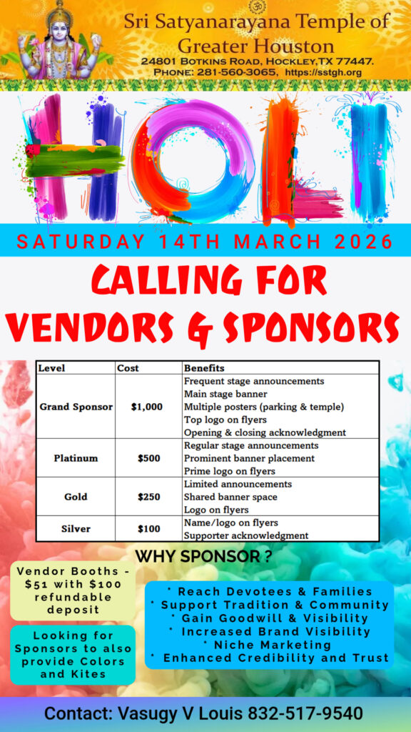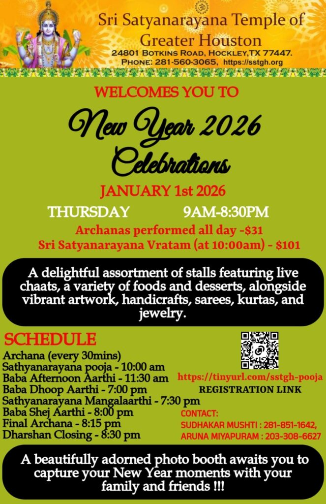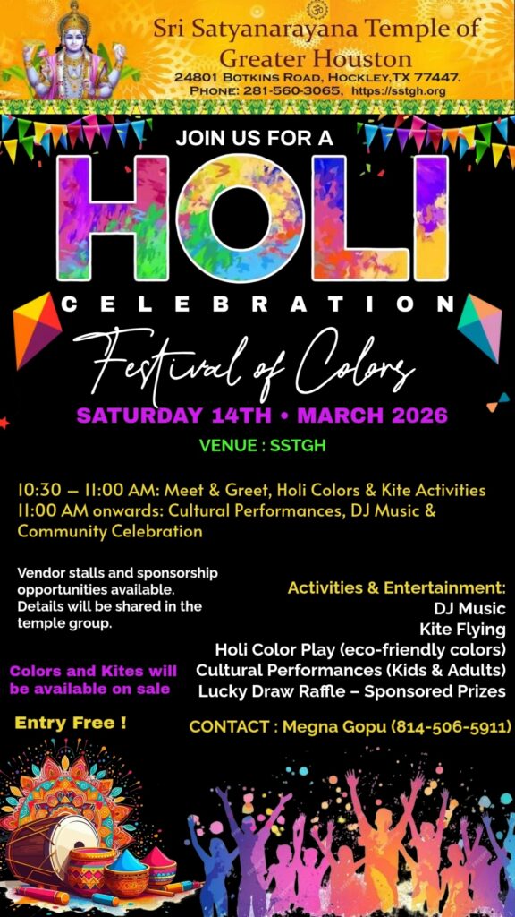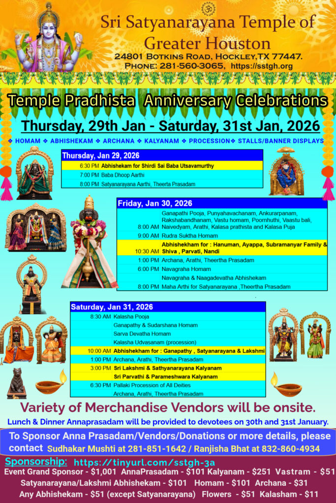 Register here for information on upcoming events and activities at Sri Satyanarayana Temple of Greater Houston and be a part of our SSTGH congregation….